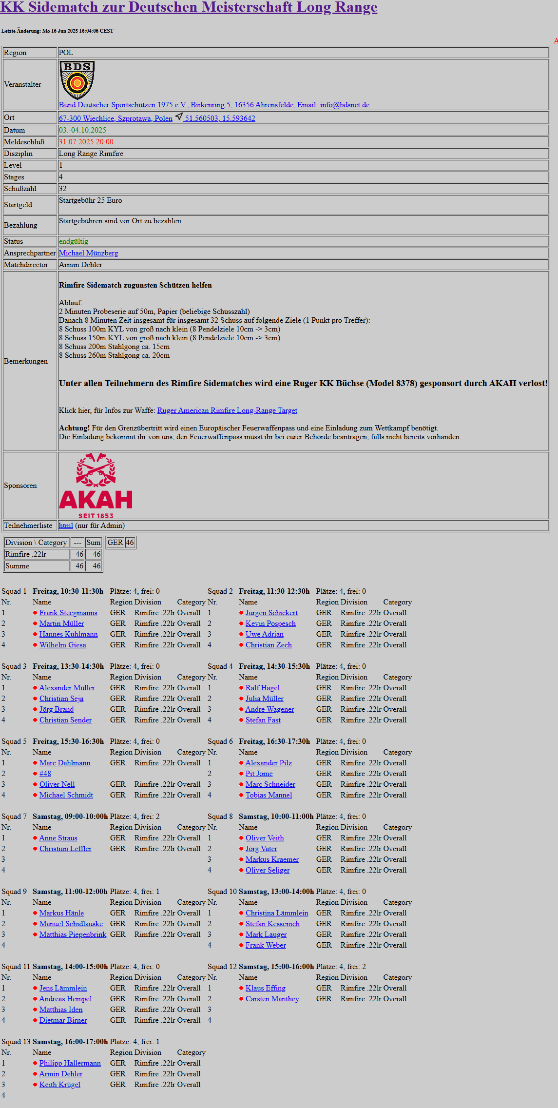 Zulassung: Zugelassen sind alle Teilnehmer die am Hauptwettkampf Deutsche Meisterschaft LongRange des BDS teilnehmen.